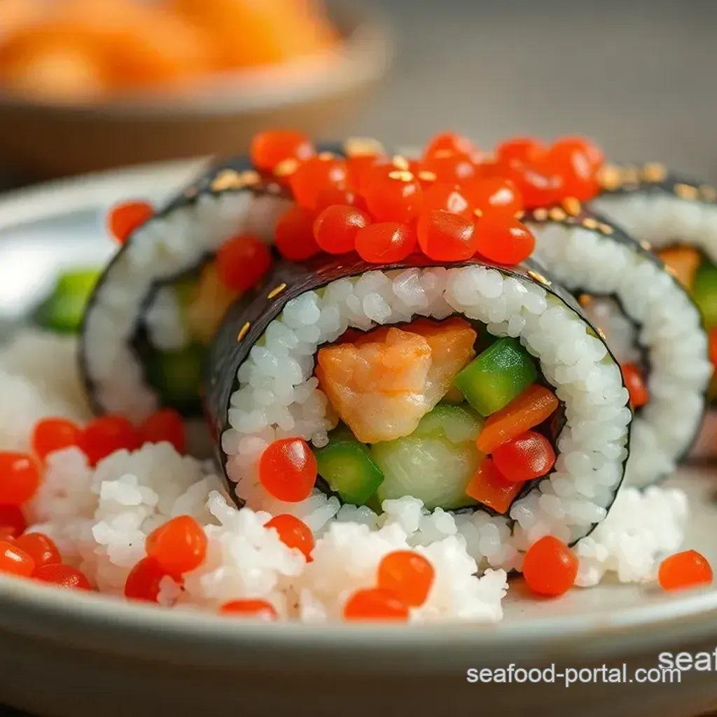 A Colorful Sushi Roll with Flying Fish Roe is a vibrant sushi dish that includes ingredients like cucumber, salmon or crab stick, avocado, and is topped with flying fish roe for added flavor. The sushi rice is rolled in nori and can be customized with various fillings.